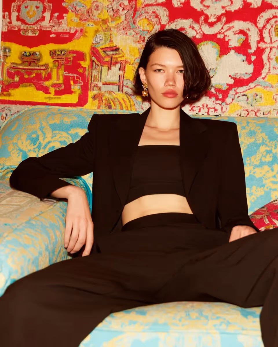 Luxury lifestyle fashion photography photograph of a luxury fashion ambassador wearing a luxury athleisure set, relaxed candid fashion pose, in a designer apartment interior. Composition: environmental portrait with a shoulder-level perspective. Lighting: soft ambient indoor lighting. Shot on full-frame camera with 50mm lens. Color grade: elegant warm neutrals. Ultra-detailed photorealistic with natural skin detail.